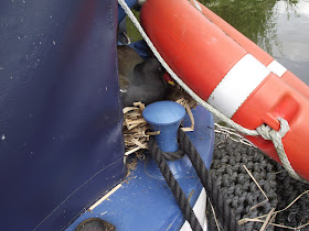 The Moorhen pictured below has decided the back of a Narrowboat would be a good place for a nest.