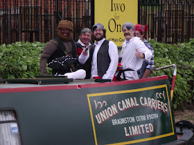 Last Friday (15/6/12) we were moored at Braunston opposite the Boat House pub, at lunch time a Hireboat arrived with a crew of twenty-somethings dressed as Pirates, they moored outside the pub on the pub moorings.